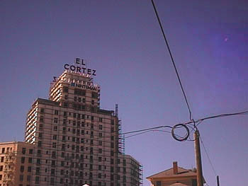 A man & woman homeless couple came upon us sitting there and cheerily suggested we check out the Halloween-specific cartoons in the Sunday Union Tribune. They were aware of the fact that the nearby newspaper machine was jammed, so they went and fetched us a free copy as matter-of-fact as can be, grinning broadly over their rotting teeth. I think there was a real homeless-to-homeless bond going on here; they would have never suspected that we, sitting dejected on that piece cardboard, have a combined household income above the national median. Since Kim works Downtown, since my company is scheduled to move Downtown in a month's time, and since our landlord is acting increasingly uptight with each passing month, Kim has started looking for a new place for us Downtown. One of her massage clients suggested getting a place in a part of Downtown called Cortez Hill, which is dominated by a grand old Hotel called El Cortez. The client said it was an "up and coming" place worthy of settler-style real estate investment. Today Kim and I went on a Sunday drive to Cortez Hill to see if we liked the place.