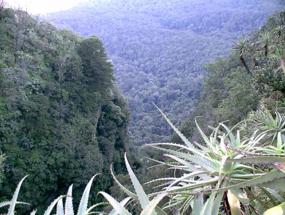 "God's Window," a scenic overlook from the Klein Drakensberg escarpment. In the foreground is native aloe plant. (Click to enlarge.)