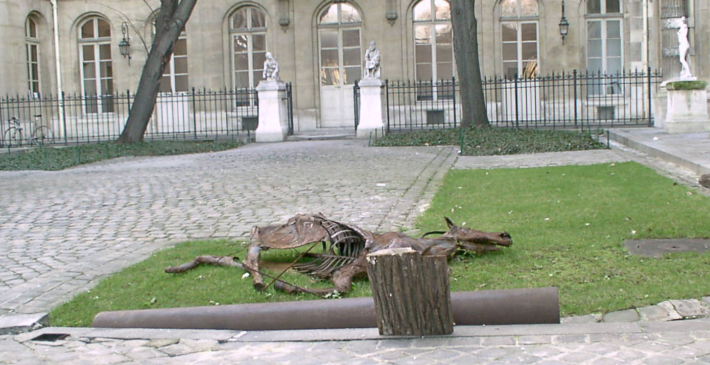 Rusty sculptures of decaying horses in the front garden of a Left Bank art academy. Click for a larger version.