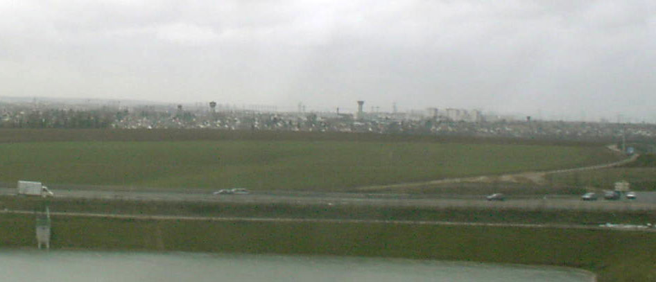 Fields meet the edge of a village somewhere in Northern France. Unlike in the United States, in Europe there is a clear distinction between town and country. Towns are always compact clusters of houses on tiny lots, usually clustered around a single church and possibly a few small industries. The town abruptly stops at its limits, and the surrounding fields are vast and utterly devoid of structures. In the United States, of course, much valuable farm land has been overrun by low-density human settlements, often situated on large five-acre lots which are mowed and "used" as lawn.